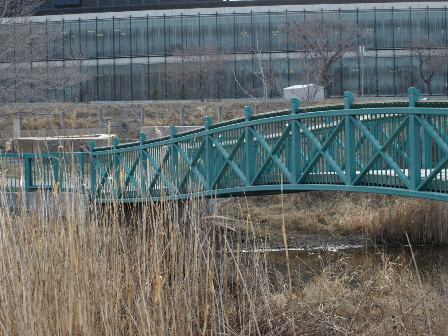 As the path crosses southward over St Matthews Ave, it enters Bluestem Nature Park, which is owned by the City of Winnipeg. Bluestem Park provides a nature buffer in between the commercial development and the gravel path. There are interpretive signs and a pedestrian bridge that crosses the Creek. At the end of Bluestem Park, the Creek flows under a train bridge that is still actively used. The gravel path does not continue under the bridge, but repeated wear from pedestrians has created a small path.